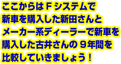 ここからはFシステムで新車を購入した新田さんとメーカー系ディーラーで新車を購入した古井さんの9年間を比較していきましょう!